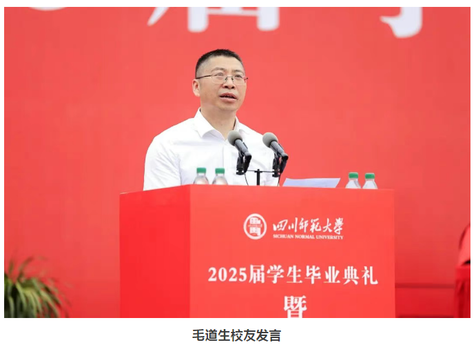 6月20日,学校在狮子山校区和成龙校区举行2025届学生毕业典礼暨学位授予仪式。教育科学学院2004级硕士、2013级博士校友,成都市教育科学研究院党委副书记、副院长(主持工作)毛道生,物理与电子工程学院93级校友、成都石室东部新区实验学校书记、校长谭崇宇作为校友代表发言。毛道生勉励毕业生们做有担当、有见识、有韧劲的奋斗者,成就最好的自己,擦亮四川师范大学品牌,献礼中国式现代化。谭崇宇巧妙运用“物理公式”阐述人生哲理,寄语大家走出属于自己的相对论人生。