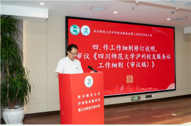 会上,与会代表听取了李渝江校友关于本次大会的筹备工作情况报告,审议通过了赵成文校友所作关于《四川师范大学泸州校友服务站工作细则》说明。