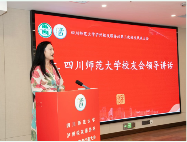 最后四川师范大学国内合作处(校友工作办公室)校友工作科科长李爽代表母校作了热情洋溢的发言,对大会的胜利召开和新一届理事会的成立表示热烈祝贺,对泸州校友服务站的各项工作给予高度肯定,希望新一届理事会继续弘扬母校精神,凝聚校友力量,开创校友工作新局面。